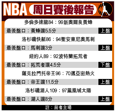 湖人在奧尼爾拿下三十六分、十六個籃板及四次封截,連同拜恩添加三十一分、十二個籃板及七次助攻下,以一面倒優勢挫太陽,報回上仗作客一敗之辱。 美聯社