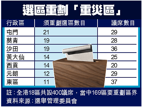 因應人口變動,根據劃界資料,超過四成選區將要重新劃界,另有少部份選區的選民人數超出標準四分之一。