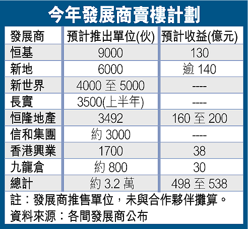 8大發展商料今年合共推售3.1萬至3.25萬個單位,當中恒基佔最多,達9000伙,最少為九龍倉,只有800戶。