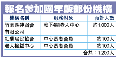 為了讓一眾獨居清貧長者也有機會同享節日歡欣,蘋果日報慈善基金特設立「新春團年飯」專戶,透過滙聚讀者的捐款,招待長者免費享用一頓團年飯。活動自上周展開以來,本報已接獲多間志願機構為近一千二百名長者申請報名參加,反應熱烈,亦同時反映需求殷切。