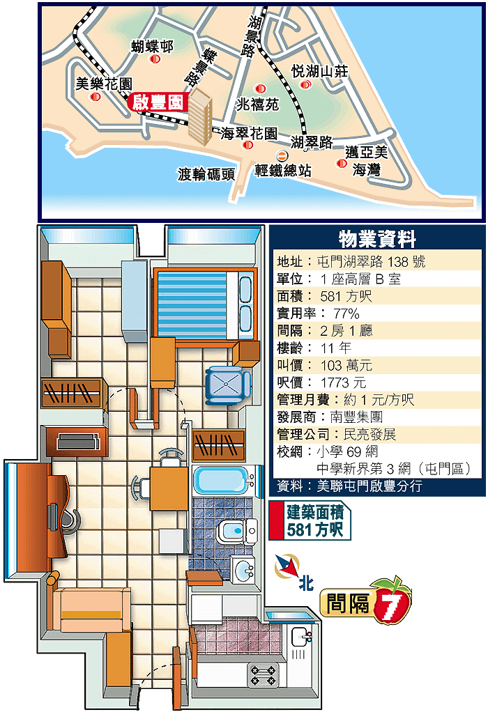 屯門碼頭區物業坐擁海天一色景致,全海景單位約100萬元有交易,如坐落輕鐵總站旁的啟豐園,1座高層B室,581方呎,廳房盡覽無垠海景,開價僅103萬元。