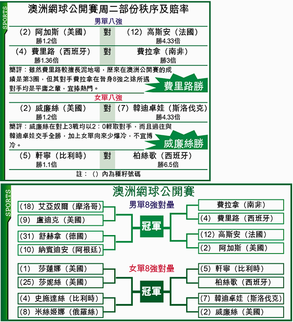兩位美國新秀盧迪克及比歷克命途各異,前者從落後兩盤的劣勢反勝俄羅斯的尤治尼三比二,比歷克則被德國的舒赫拿以三比一淘汰。 綜合澳洲外電
