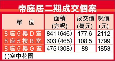 信和集團昨續推出帝庭居二期,繼前日發售第10座後,昨加推第8座32個單位,呎價由1800至約2300元。發言人表示,截至晚上近八時半,再售出約20伙,連同之前預售的20多伙,兩日累積逾40戶。