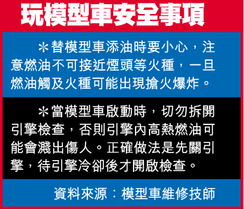 【本報訊】十四歲模型車發燒友昨日在大埔寓所替模型車注入燃油時,報稱因燃油濺落在高熱引擎,變速器冒出火花,燃油即時搶火爆炸,火球撲出,灼傷男童雙手及頭臉多處,前額頭髮亦燒焦,由鄰居報警送院。模型車維修技師指出,類似意外十分罕見,呼籲模型車迷注意安全。