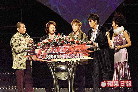 前晚陳冠希(Edison)在廣州舉行的《音樂先鋒榜2002年度頒獎典禮》奪得「人氣歌手」獎,當他在台上表演時,一位熱情女歌迷上台送花之餘,又趁機攬着Edison,更親吻他的面頰,令全場嘩然,Edison則只可尷尬儍笑。