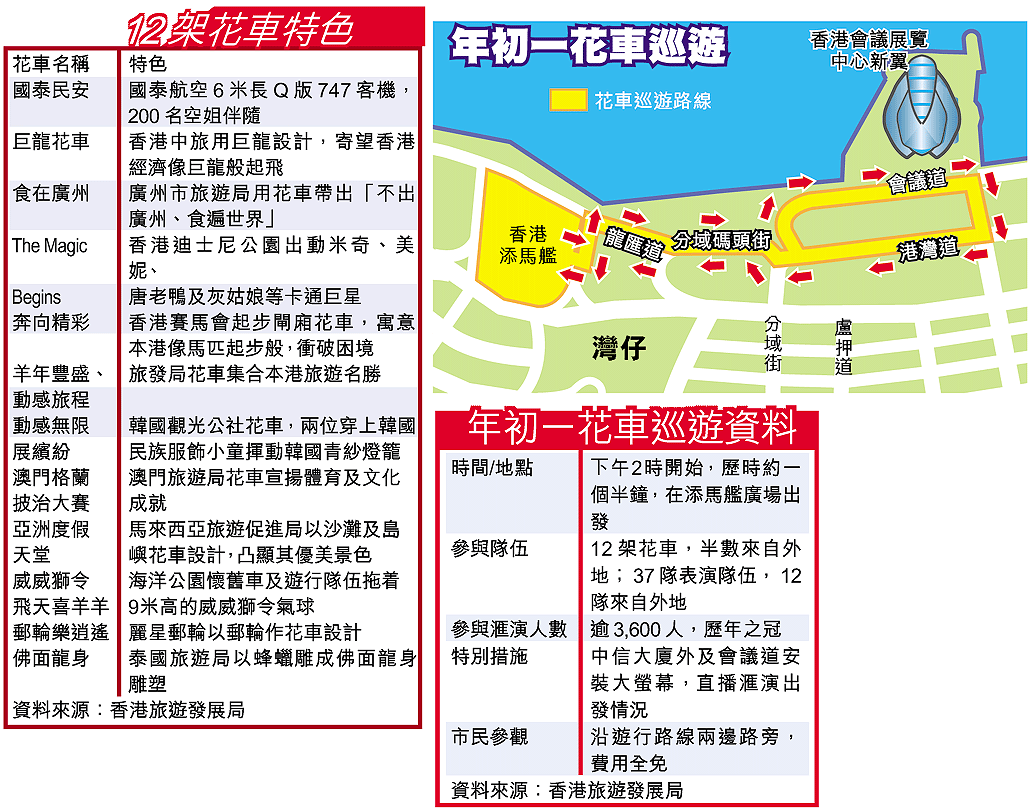 【本報訊】旅遊發展局連續第八年在年初一舉行花車巡遊滙演,十二輛本港及外國的花車,以及三十七隊來自各地的表演隊伍精英,向全港市民及遊客拜年。旅發局預計,滙演將吸引近三十萬人在灣仔及金鐘一帶觀賞這一年一度的盛事。