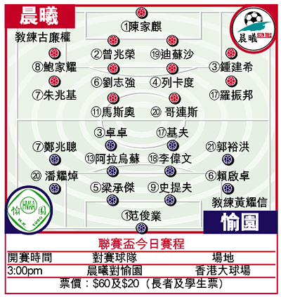 【本報訊】暫列聯賽榜冠亞席的晨曦及愉園,今午在大球場爭奪季內首項錦標──聯賽盃冠軍,論實力及近況各有可取,相信戰況肯定激烈;不過,考慮到愉園防線未可過信,而晨曦前鋒哥連斯及馬斯奧擅於把握機會,故有力捧盃及贏取五萬元冠軍獎金。