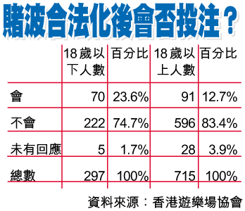 遊樂場協會及耆康老人福利會月初訪問一千零十二名市民,四成多人為二十四歲以下,三成多人為六十歲以上,結果整體而言,兩成九人曾參與賭博活動,其中十八歲以下的受訪者中,兩成承認曾有此行為,一旦賭波規範化後,所有受訪者中,一成六人會投注,十八歲以下受訪者更有兩成四會落注。