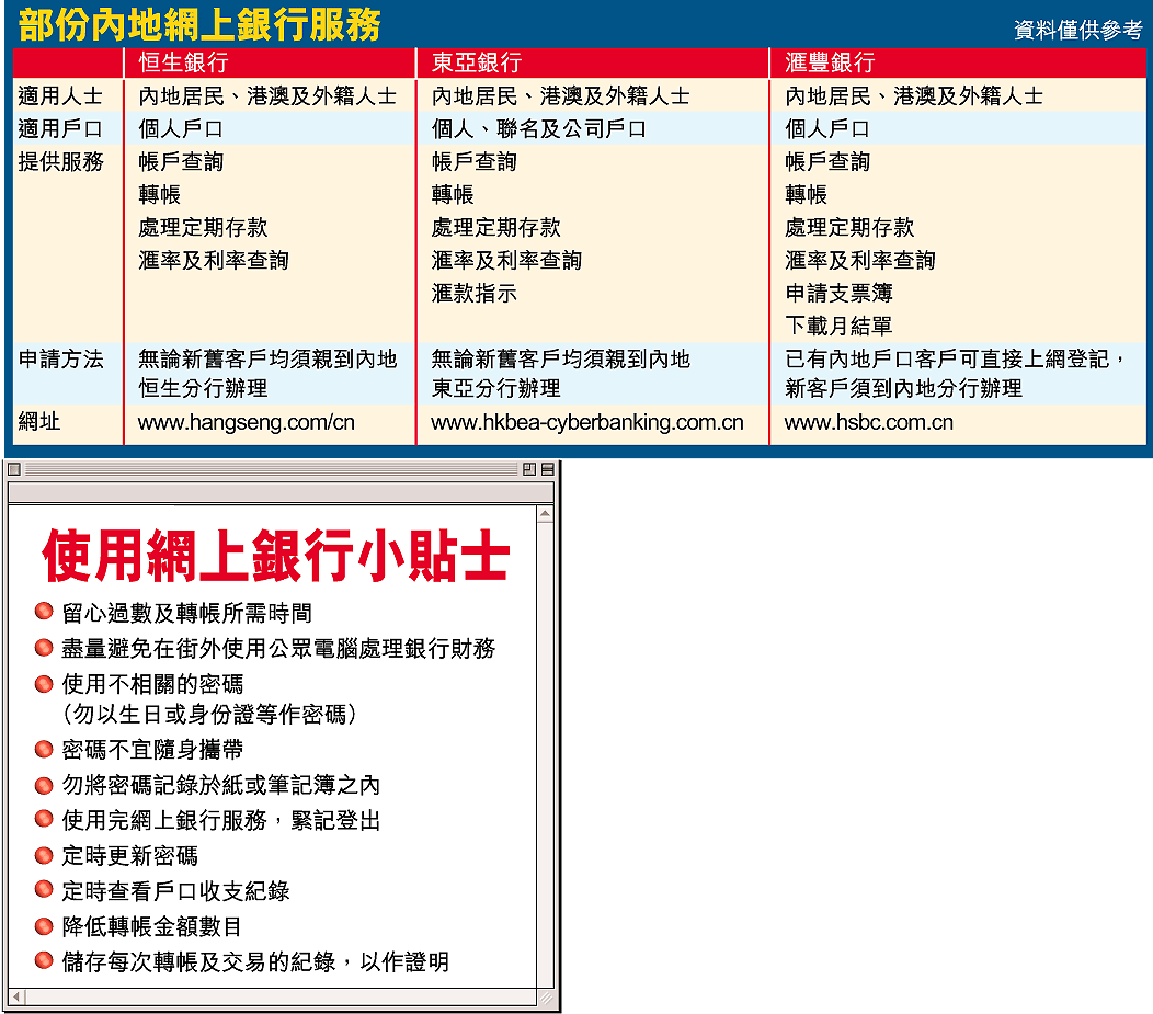 香港銀行在國內推出網上銀行服務,最受惠的自然是開有戶口的內地人,但同時亦為擁有國內戶口的港人製造了方便。