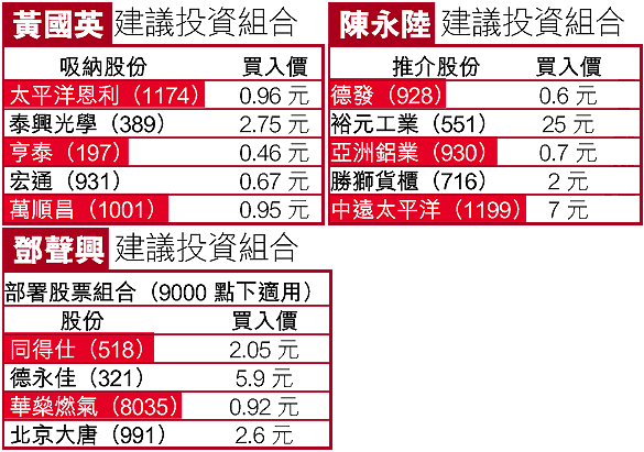 除藍籌股外,鄧聲興計劃在農曆新年前後吸納出口股,例如同得仕(518)和德永佳(321)。他認為,雖然美國經濟不太好,但消費能力仍能維持,而且去年第3、4季本港及中國的出口數字強勁。另外他會買中資股,如華燊燃氣(8035)及北京大唐(991)。