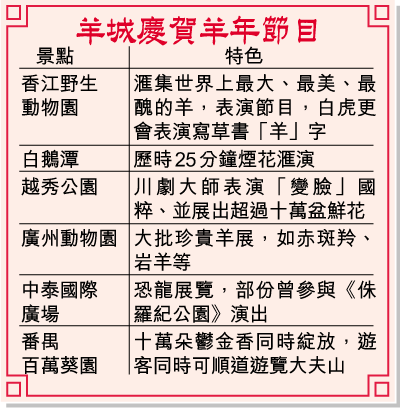 素有「羊城」之稱的廣州,迎接羊年到臨的節目份外精采。除了今晚在白鵝潭會有煙花滙演外,天河公園還會舉辦首屆廣州廟會藝術節。至於番禺香江野生動物園則特別推出「千羊賀歲」節目,雲集了全球二十八種珍貴羊種表演「羊騷」,如跳火圈、跨欄、直立行走、踩梅花樁等。被譽為「鎮園之寶」的白老虎則會在「白虎秀才唐白虎」節目中表演專門精心苦練的草書「羊」字,向市民表示祝賀。