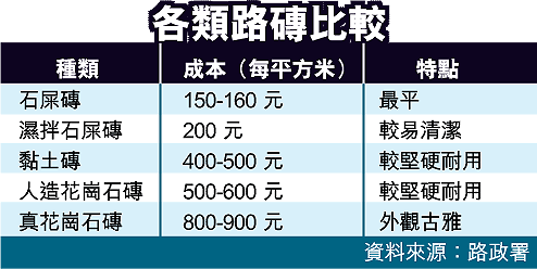 他表示,該署會因應不同的環境及實際需要決定鋪設路磚的種類,一般會鋪設石屎磚或濕拌石屎磚,人流較高的商業區或旅遊區則會鋪較貴及較耐用的黏土磚及人造花崗石磚,由建築署負責的上環摩羅街美化計劃則將選用真花崗石磚,需八百至九百元一平方米,但這屬特別的旅遊推廣項目。