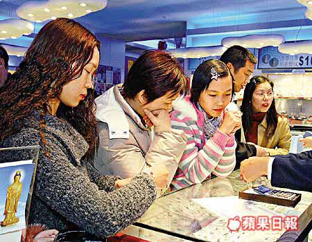 另外,紅磡民樂街一間專做遊客生意的珠寶金行昨亦人頭湧湧,有上海來客在店內一口氣便買下十一萬五千元首飾,而另一名內地遊客用十二萬元買了一粒鑽石。