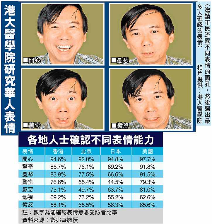但港人看「眉頭眼額」的能力,已經較日本人及北京人為高,日本人看表情的準確度最差,大部份人無法認出「厭惡」、「憤怒」及「驚慌」表情;北京人則主要不能識別「厭惡」及「驚慌」的表情。