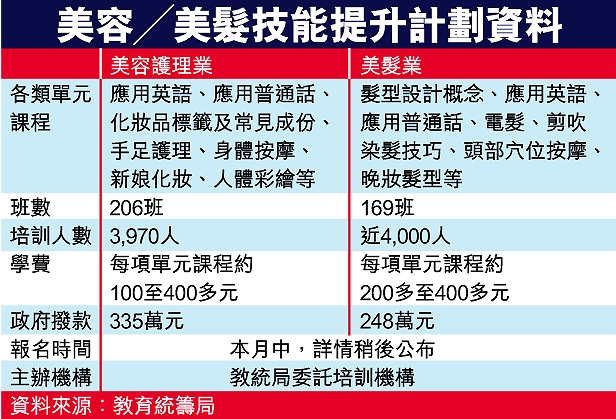 【本報訊】本港女士很重視容貌,但本港美容師水準參差,教育統籌局將於下月起,撥款三百三十五萬元,為在職美容護理業員工,推出十九項技能提升課程,改善美容師質素。課程內容包括化妝品標籤成份、皮膚結構、各類按摩入門,以及時下最流行的纖體理論及香薰治療。 記者:譚暉