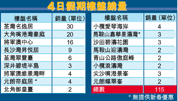 【本報訊】春節4日公眾假期共售出115宗貨尾,與去年3天假期售出116伙的成績相若,在本港經濟未明朗及國際局勢不穩的陰影下,一手成交尚算力保不失。各盤中以人丁最旺的荃灣名逸居獨佔鰲頭,僅過去兩日已售出30伙,主要由同區客承接,而同屬上車盤的大角嘴港灣豪庭,則以4日20宗成交居次。
