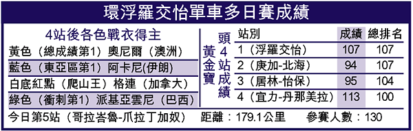 值得一提的是來自巴西、現年二十四歲的派基亞雲尼,昨日是他連續第三日奪得分站冠軍。而黃色戰衣仍由澳洲的奧尼爾保持住。