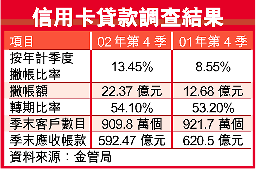 【本報訊】金管局公布,去年度第4季「按年度」計的信用卡撇帳率為13.45%,較對上季度14.55%為低,全年計撇帳率則為13.25%,相等於2001年5.46%的1.4倍。該局及銀行界人士均指出,去年第4季的撇帳率已有穩定迹象,去年度因會計制度改變而造成的比率飆升現象,今年度應不會重現,但最差的情況是否已過去,仍有待觀察。
