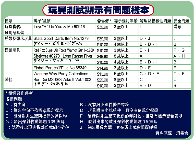 消委會在最新一期《選擇》月刊公布測試了的五十款玩具,大部份產自中國,在超級市場、連鎖店、百貨公司及特賣場均有出售,價錢由九元九角至一百七十九元不等,包括玩具食物與日用品套裝、球類及彈珠玩具、彈射玩具及其他類別等,其中四十九個樣本標明適合三歲或以上小童,一個適合三歲或以下小童,而當中有七個只以日文寫上有關標示,並無中文警告字眼。