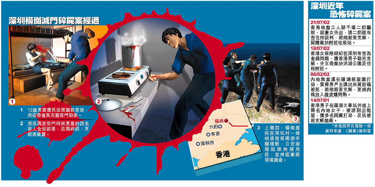 【本報訊】深圳龍崗區橫崗鎮深坑村發生五屍命案。一個從事珠寶加工的內地商人遭人滅門殺戮,全家五口盡遭殺害之餘,殺人狂魔更將五具屍體逐一支解、碎屍、烹煮後四處棄置。上周四上午,當地居民在村內一條明渠發現兩個載着手腳殘骸的膠袋,大驚下報案。公安接報後證實五名死者的身份,並將死者所住的橫崗鎮深坑村全村封鎖,迅速拘捕一名涉案疑兇。