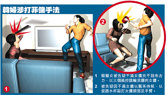 女傭作供指,去年五月到被告家上任當女傭,被告與丈夫及一名五歲兒子同住,去年十二月二十六日晚上,被告不滿她找不到朱古力,在客廳中拾起梳化上的三個遙控器向她的身體輪流拋擲,導致她的腿部紅腫瘀傷。