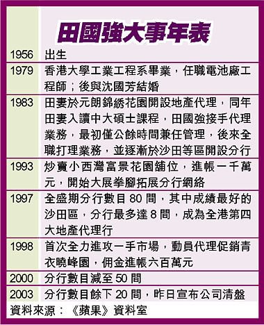 田國強工程師出身,七九年於港大畢業後,本來任職電池廠,後來由於太太沈國芳進入中大攻讀碩士課程,為了讓太太可以全心全意進修,決定利用公餘時間為太太打理於元朗錦綉花園開設的地產代理行業務,後來愈做愈有興趣,結果全職投入,並開始着手拓展業務。