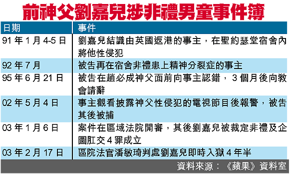四十二歲被告劉嘉兒被裁定兩項非禮、一項誘使他人作嚴重猥褻行為及一項企圖肛交罪成。案情指九一年一月四及五日,年僅十五歲的事主按被告吩咐到觀塘聖約瑟堂神父宿舍過夜,被告與事主共浴時替事主手淫,其後又藉詞替事主進行「性治療」,整晚把弄事主的陽具,翌晨更三度試圖與事主肛交。被告於九二年七月,再在宿舍內要求事主脫去下裳,然後非禮其下體。