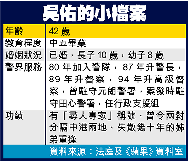 四十二歲被告吳佑的任職警隊逾二十年,案發時任高級督察,駐守沙田田心警署,昨日他穿着西裝,沒有律師代表,庭上以英語與法官對答,而其妻與近百親友及同袍到庭支持,以致座無虛席,部份親友要站在門口,可謂「迫爆」法庭。