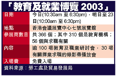 【本報訊】一連四天的「教育及職業博覽2003」,今日在灣仔會議展覽中心揭幕,共有三百六十六家機構參展。雖然港府已決定由四月一日起,停止聘請公務員,但由於警方將向政府申請豁免凍結招聘員工,因此仍會即場為有志加入警隊的市民登記,相信是全場唯一接受市民申請職位的官方攤位。