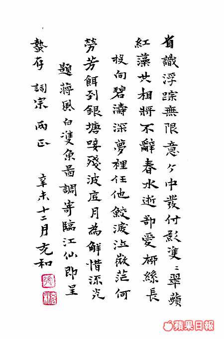 我向來深信翰墨聚散講緣份。得了胡適這幅字,我先是遇到張充和的一些零散詩文,覺得她的文筆確是上乘;不久,陸灝又送給我一張張充和寫給施蟄存先生的詞箋,小楷清越疏朗,嫻雅中遮不住的是那份含蓄的豪氣,長短句尤其推敲周全,玲瓏標緻。近來,我閑時都在細讀《沈尹默蜀中墨迹》,那又是張充和所藏老師的墨寶集,書首她寫的那篇〈從洗硯說起〉固然好看,書尾〈仕女圖始末〉說的是她一九四四年畫的一幅畫失而復得的經過,讀畢我倒深悔自己一九九一年錯過了在蘇州拍賣會上競買這件文獻的機會。