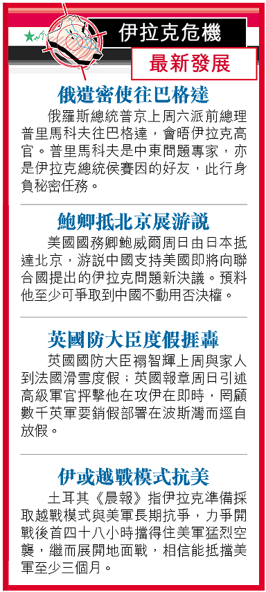 通過新決議後又如何?澳洲外長唐納上周六表示,新議案不會即時引發戰爭,但只會給予侯賽因「幾日時間」,要麼解除武裝,要麼面對軍事行動。英國稱爭取安理會通過新決議案,是「推動和平的最後努力」。英國國防大臣禤智輝周一探訪部署在波斯灣的英軍,卻是出兵在即另一迹象。