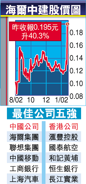 《遠東經濟評論》評選200間亞洲最佳公司,今年首次增設中國公司,海爾集團壓倒聯想控股(992)及中國移動(941)奪魁,香港最佳公司由滙豐控股(005)勝出。