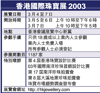 去年香港貴重珠寶出口額190億元,較01年增加17%。其中出口至美國、英國及德國的增幅分別為25%、19%及17%;銷往內地的珠寶更急升23%。為了增加珠寶展的效益,大會組織了40個買家團,合共近1000名買家參觀展覽,買家主要為內地、澳洲、杜拜、意大利、日本、墨西哥、西班牙、台灣及美國的百貨公司及連鎖店買手。