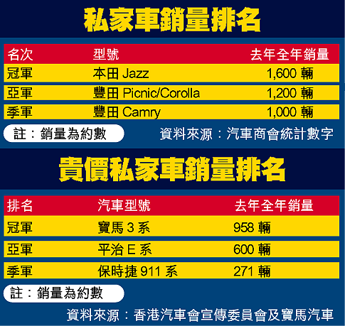 私家車中銷量最高的是本田Jazz,共售出近一千六百輛。Jazz屬小型車,售價只約十萬元,耗油量比一般房車低二至三成。銷量排第二的豐田七人車Picnic則賣出一千二百多輛;而多年來都是銷量冠軍的豐田Corolla,去年銷量只有一千二百多輛,僅能與Picnic一同屈居亞軍。過去銷量極高的本田Civic,銷量更跌至八百輛以下,三甲不入。