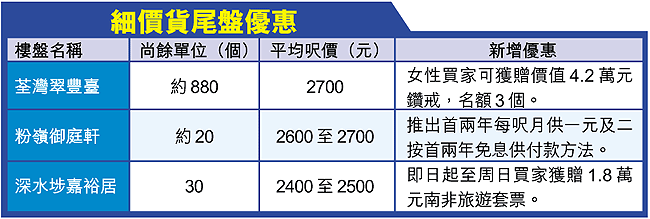 【本報訊】市場注意力近期集中幾個大型豪宅新盤及中價貨尾盤,令細價貨尾盤的銷情放緩。粉嶺御庭軒、深水埗嘉裕居及荃灣翠豐臺,昨日即推出五花八門的優惠及付款方法,吸引市場注意,力圖散貨,但仍堅持不減價速銷。
