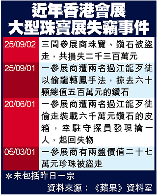 據資料統計,僅○一至○二年,在大型珠寶展覽中涉及失竊的珠寶總值近一億元。