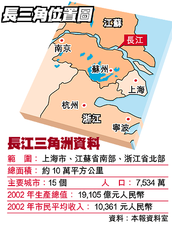 以上海為中心的長江三角洲共有十五個城市,雖然土地面積只佔全國的百分一,人口只佔百分六,但生產總值(GDP)卻佔了全國的百分十八。長三角與珠三角一樣,在整合各個行政區域問題上,同因地方保護主義而困難重重。