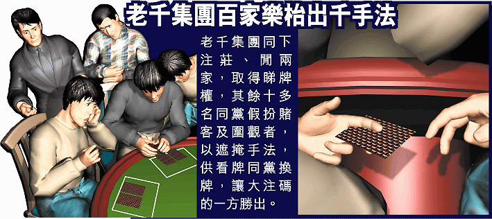 澳門賭場最近上演「千王鬥賭王之偷天換日」,一個港澳老千集團在賭王何鴻燊旗下賭場的「百家樂」賭枱上,眾目睽睽下神不知鬼不覺地進行「換牌」,結果先後贏了一千五百萬元之多,雖然事後其中四名成員被擒,但賭場也因為此事要更改「睇牌」規矩,今次賭王都可說是被剃眼眉。