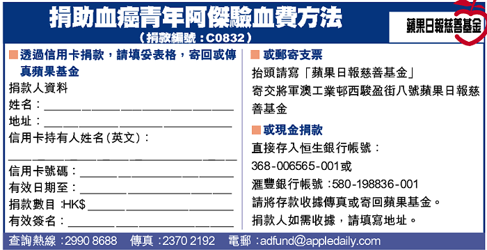 蘋果日報慈善基金迄今為阿傑籌得驗血費用約八萬元。善長所捐的一分一毫,將可集腋成裘,令今次富有意義的驗血行動能夠順利進行,亦為阿傑燃點一線生機。