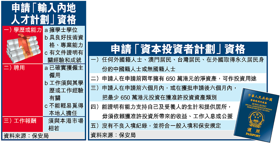 葉劉淑儀昨日在記者會上說,放寬輸入內地人才計劃實施後,具備大學學士學位的良好教育背景,或特殊技術資格的內地人才,若確實獲本港公司聘用,有關空缺又未能在本港覓得合適人選,有關公司便可申請內地人才來港工作,新政策不設人數上限及行業限制,審批申請需時六個星期。