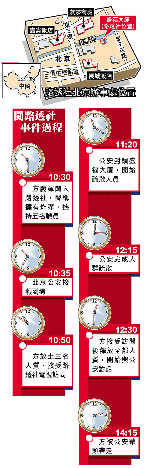 這名男子自稱叫方慶輝,是黑龍江人,已失業五、六年,之所以持炸彈闖入路透社,是為了伸張社會正義,揭露中國的黑暗和腐敗,不介意個人生死。在結束約兩個小時的訪問後,方慶輝又釋放了其他人質,並通過電話與公安對話。至下午二時十五分左右,方慶輝被公安制服及押上警車帶走。公安表示,方慶輝患有精神病,他聲稱的炸彈是假的。