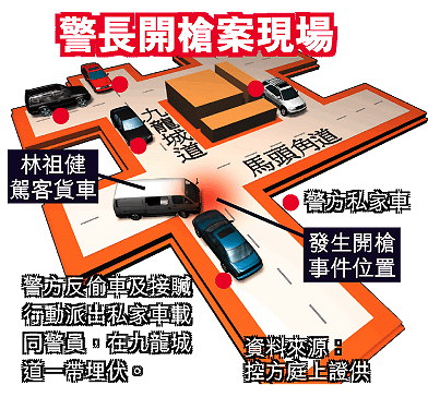 控方案情指出,被告發射的子彈穿過司機位玻璃窗,射中司機林祖健右頸穿過頸動脈,進入脊椎後碎成兩節,碎片擊中脊髓,留在脊椎。司機送往醫院接受手術,延至同年七月十二日證實死亡。另外,警員當場拘捕的兩名乘客,相信與黑社會和勝和有關,均有刑事紀錄。至於被告送院檢查,證實右手手指尾有瘀傷。