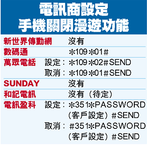 本報向本港多間網絡商查詢,發現部份網絡商已就有關問題作出相應對策,用戶可根據指引設定手機網絡,暫時關閉漫遊功能,避免無端被收取漫遊費用(見表)。