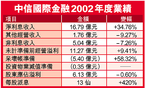 個人破產率上升及中信嘉華銀行因抵押物業減值而作出7800萬元準備,令中信國際金融控股(183)去年度呆壞帳撥備增加58%,猶幸該集團淨利息收入升34.76%,及淨息差擴闊8點子至2.32%,令去年度純利仍有6.13億元,僅微跌0.6%(見表),較財經資訊供應商ThomsonFirstCall綜合17家證券行的盈利預測7.08億元為低。