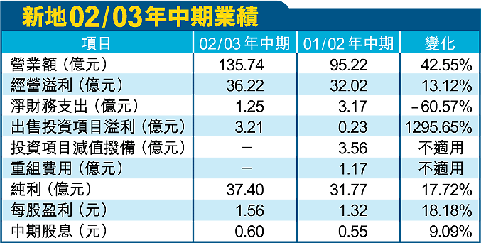 新地截至02年12月底止半年營業額135.74億元,增加42.55%。每股盈利1.56元,其中物業銷售的溢利由8.78億元,上升至14.77億元,升幅達68%。不過,租金收入則由20.9億元下跌至19.59億元,跌幅達6.26%。期內,該集團毛利率由約20%下降至約16%,主要是期內以接近成本價出售珀麗灣第1期。
