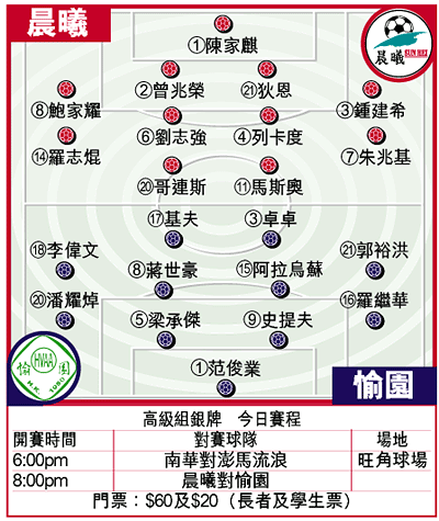 【本報訊】高級組銀牌足球準決賽今晚假旺角場上演。衞冕冠軍南華淘汰賽經驗豐富,頭場迎戰澎馬流浪稍被看好;壓軸的愉園鬥晨曦雙方實力接近,考慮前者演出較穩定,料可擊敗對手一報聯賽盃決賽不敵之辱。
