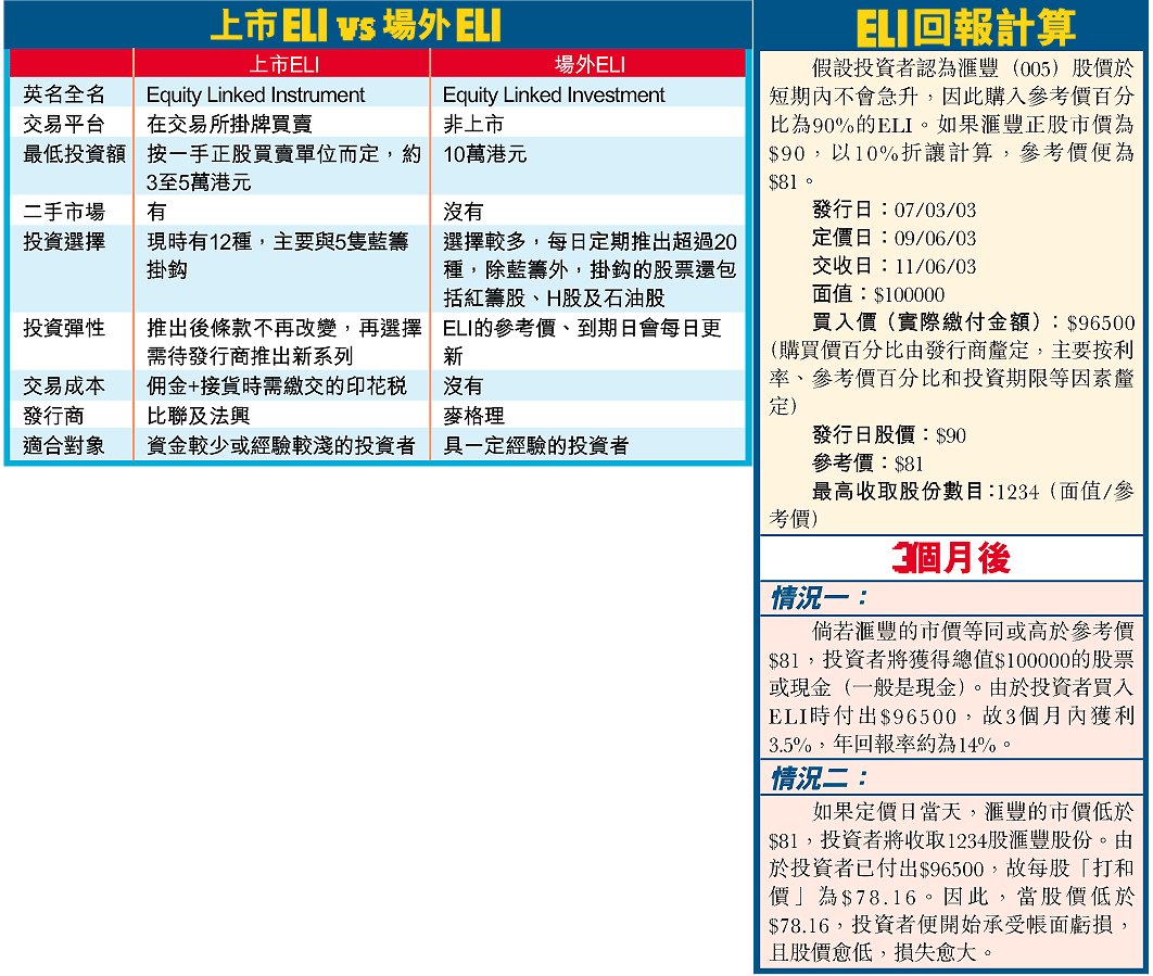除了買賣途徑外,兩者的最低投資額亦有分別──場內ELI的入場費只需數萬元,甚至低至數千元,但場外ELI則要10萬元。可見前者更適合小額投資者。
