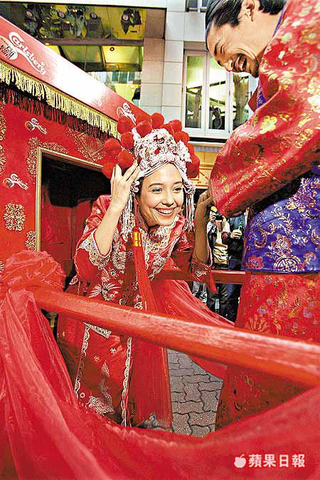 「嘉士伯先生」娶「蘭桂坊小姐」過門?蘭桂坊噚日張燈結綵,舉行中式婚禮,請來兩位外籍俊男美女扮演一對新人,大搞「嘉蘭聯婚」,宣布嘉士伯成為蘭桂坊指定啤酒,為期兩年。