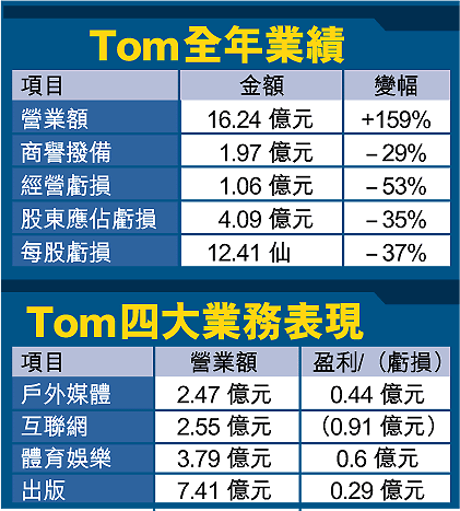 【本報訊】Tom.com(8001)去年度營業額雖大增159%,至16.24億元,但仍錄得虧損4.1億元。扣除早期收購所產生的商譽撥備1.97億元後,股東實際虧損2.12億元,仍高於財經資訊供應商ThomsonFirstCall綜合10家證券行平均預測虧損2億元。
