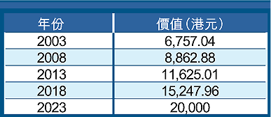 下表顯示上述零息債券在不同年期的不同價值﹙20年期,孳息率為5.5%,面值為20,000港元,到期日為2023年1月﹚(見表):